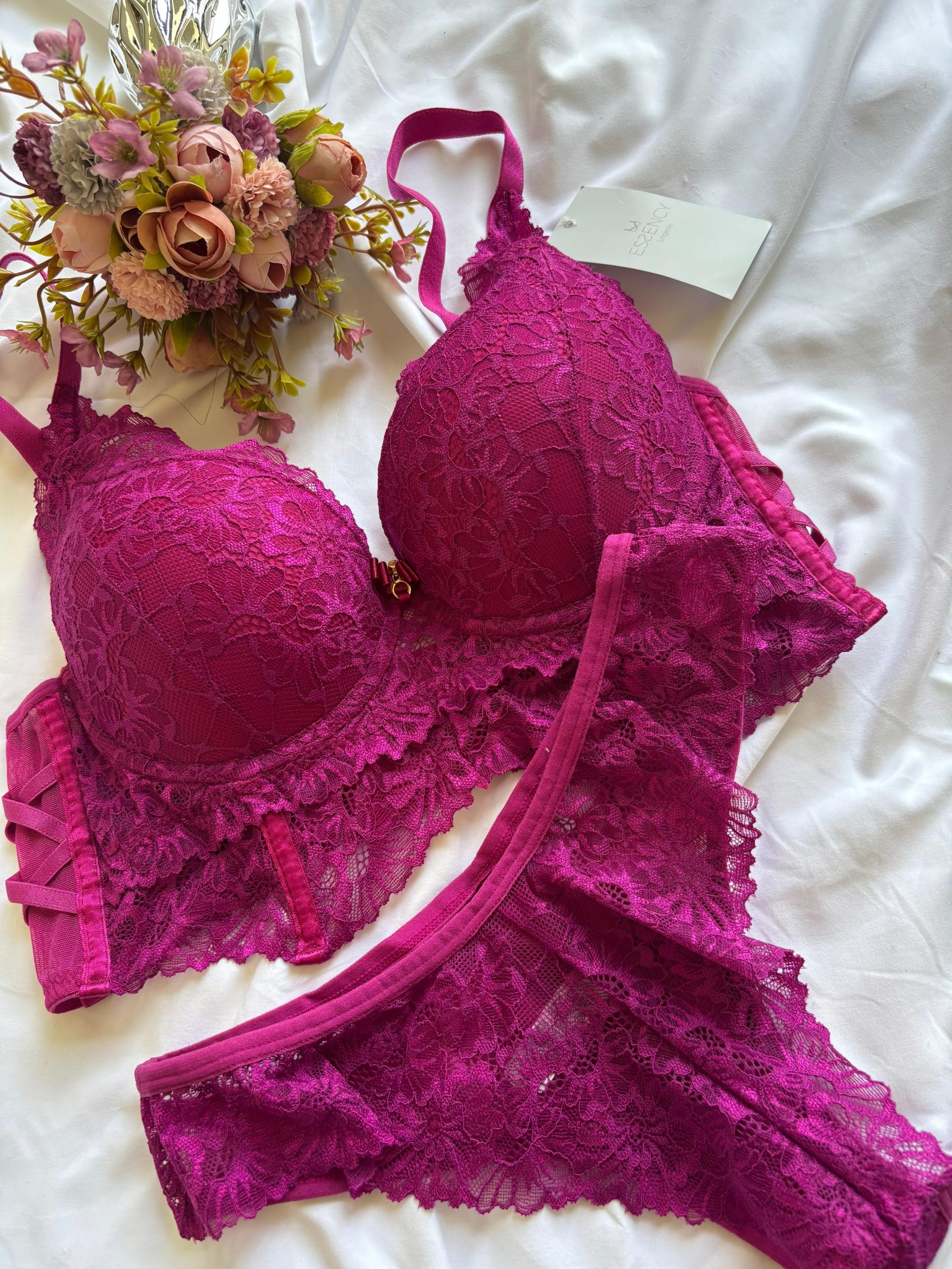 Conjunto Lia, todo em renda, sutien de bojo laterais largas, calcinha fio de renda.