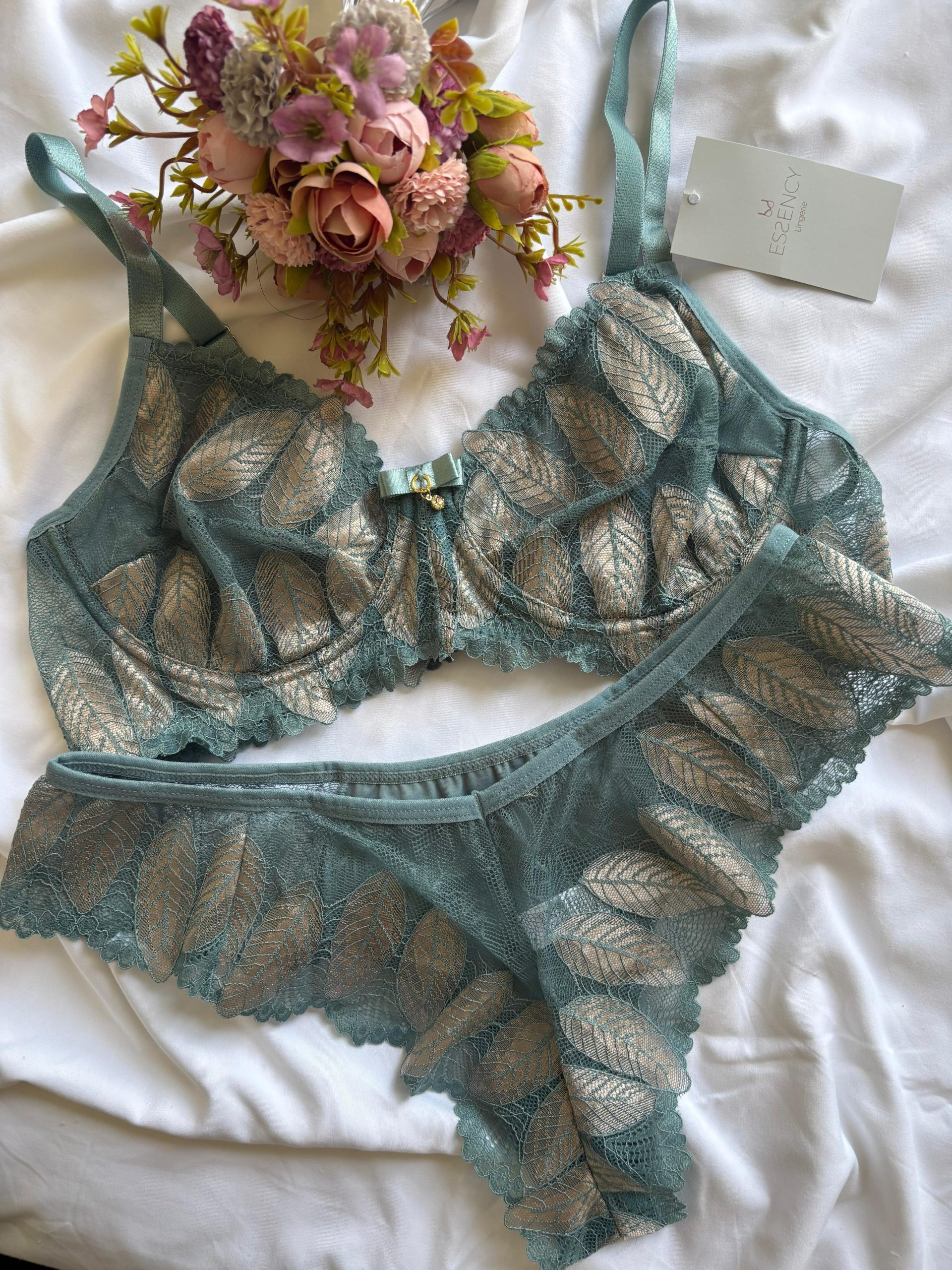 Conjunto de lingerie Flora todo em renda trabalhada, calcinha fio também em renda.